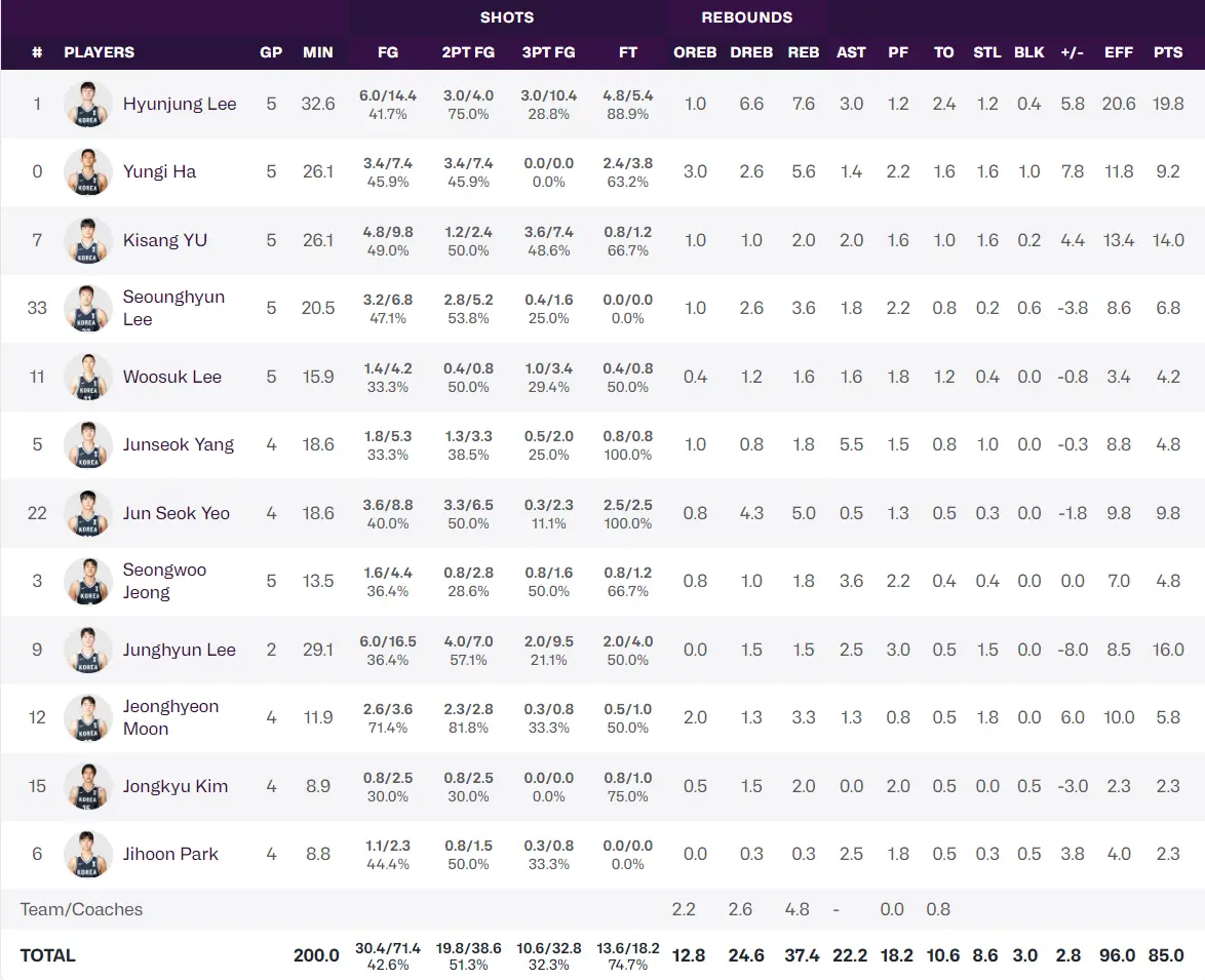对阵中国队一战韩国三分球24中3,三分命中率12.5%创造本届亚洲杯最差,5场比赛打完三分命中率下滑到32.3%(32.8出手命中10.6个),这就是郭导外线防守的成功。